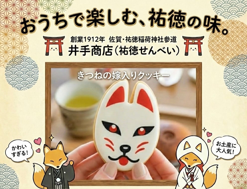 佐賀県鹿島市の祐徳稲荷神社のきつねの嫁入りをモチーフにした「きつねの嫁入りクッキー」です。 2枚入りで1,200円(送料別)で販売中。 特徴 ・1枚1枚、個包装された“きつねイラスト入り”の手づくりクッキー ・きつねの形をした大きめサイズ(100mm × 63mm)で、見た目のインパクトも抜群 ・可愛いだけじゃない、サクサク香ばしい本格派の味 ・粉砂糖と卵白を混ぜた「アイシングクリーム」でクッキー表面をデコレーションし、華やかな仕上がりに ・祐徳稲荷神社と一緒に撮影すれば、SNS映えも抜群 ・お土産やプレゼントにもぴったり 皆さまにお届けできるのを心より楽しみにしています。 原材料名 砂糖、小麦粉、ショートニング、卵、オリゴ糖、食塩、ゼラチン、水飴、香料、膨張剤、酸化防止剤(VE)、着色料(赤102、黄4、赤106、青1) 賞味期限 2ヶ月